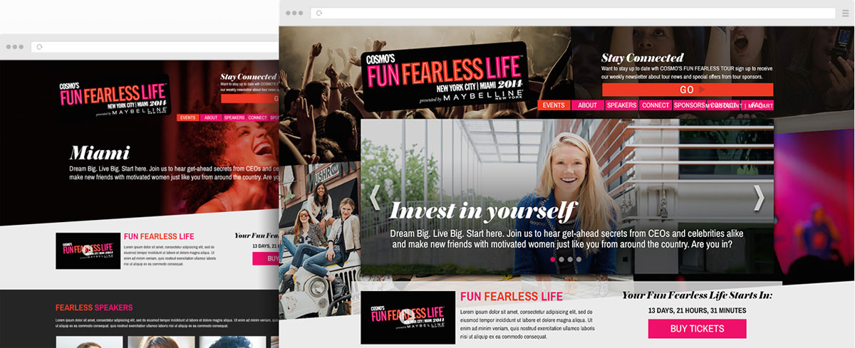 When Cosmo, along with WME, engaged Idea-Loop to design and develop the tour’s promotional site, we decided to create an experience that embodied the cheeky iconic vibe while offering easy access to the entire range of Cosmo’s audience.