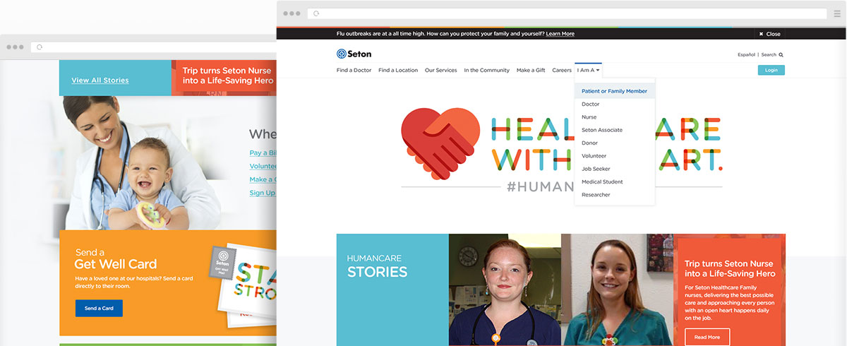We quickly realized Seton would require much more than a Band-Aid. In fact, this project seemed to be about as big as the healthcare system itself. Each of Seton’s different locations had their own individual website, so fluidity and ease of use were pretty much nonexistent. We dove in, creating one giant network for all of Seton hospitals and clinics. We then went on to create brand fluidity across all Seton collateral, including: promotional material; sub-websites; mobile apps; digital and traditional print media assets; internal and external communication pieces and complete social media assets.